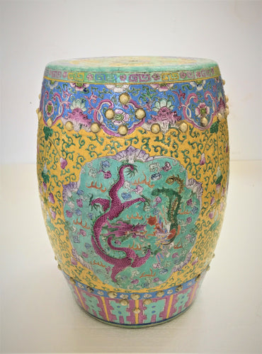 Vintage Painted Porcelain Garden Seat in Famille Rose Colors with Dragon and Phoenix