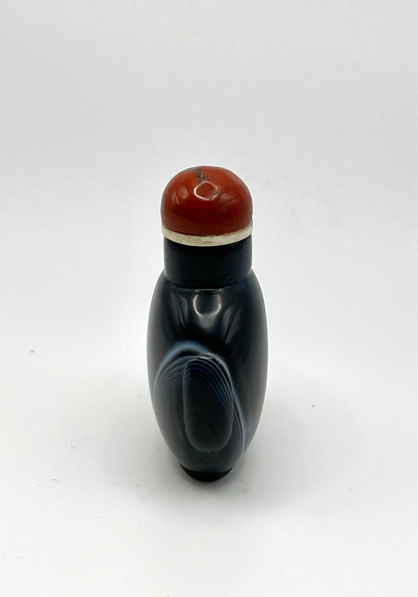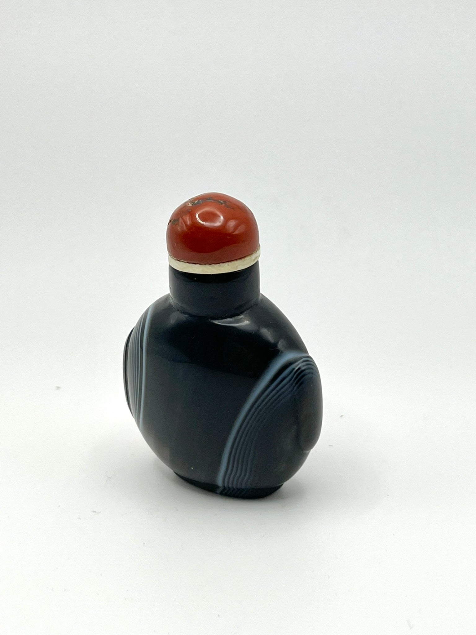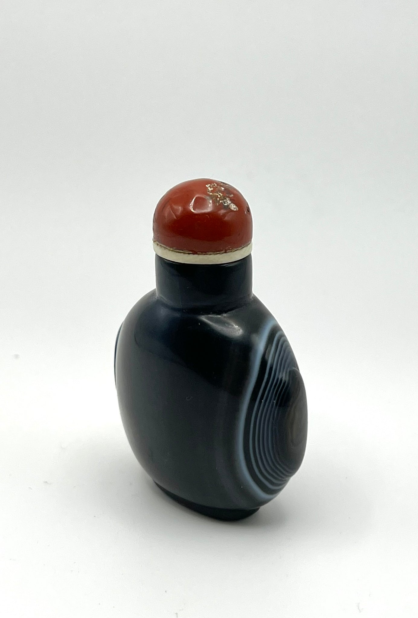 This is an unique black agate bottle. The carver was very ingenious to select a rock in the right proportions to be a snuff bottle and carved it making use of the parallel bands of white to be positioned at both sides. The end result is the white bands appeared to be "eyes." In my years of collecting, it is the only one of its kind. I find it to be very special. The bottle is small and it feels good to hold in my hands. It is of a flattened globular shape with a small raised oval foot which is nicely done. The opening is quite large for its size. It is still a vintage bottle made after 1970's, but it would be dated in the late 1970's to early 1980's. It has a bespoke or custom made stopper to enhance its appearance, a dome shape red jasper top on a beige collar.