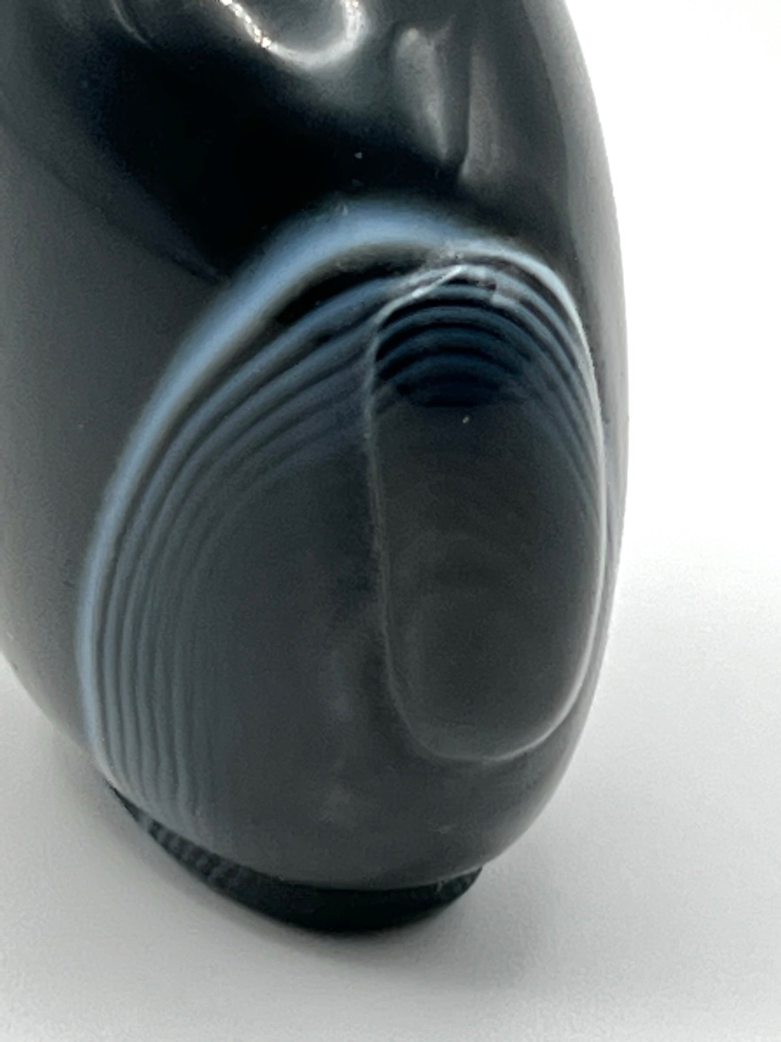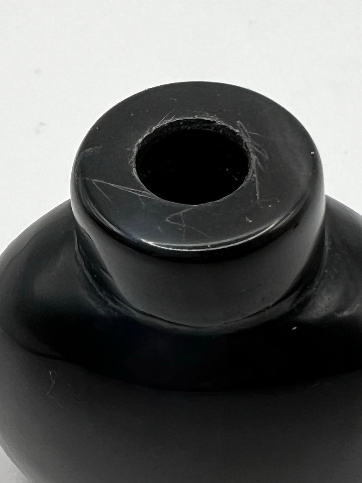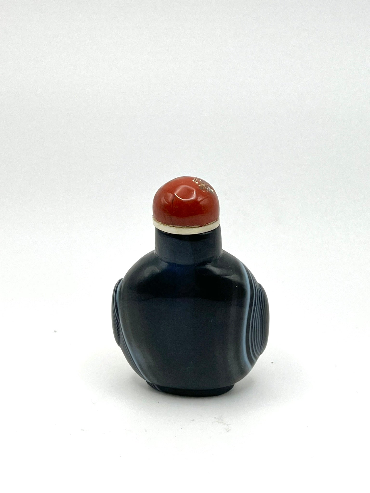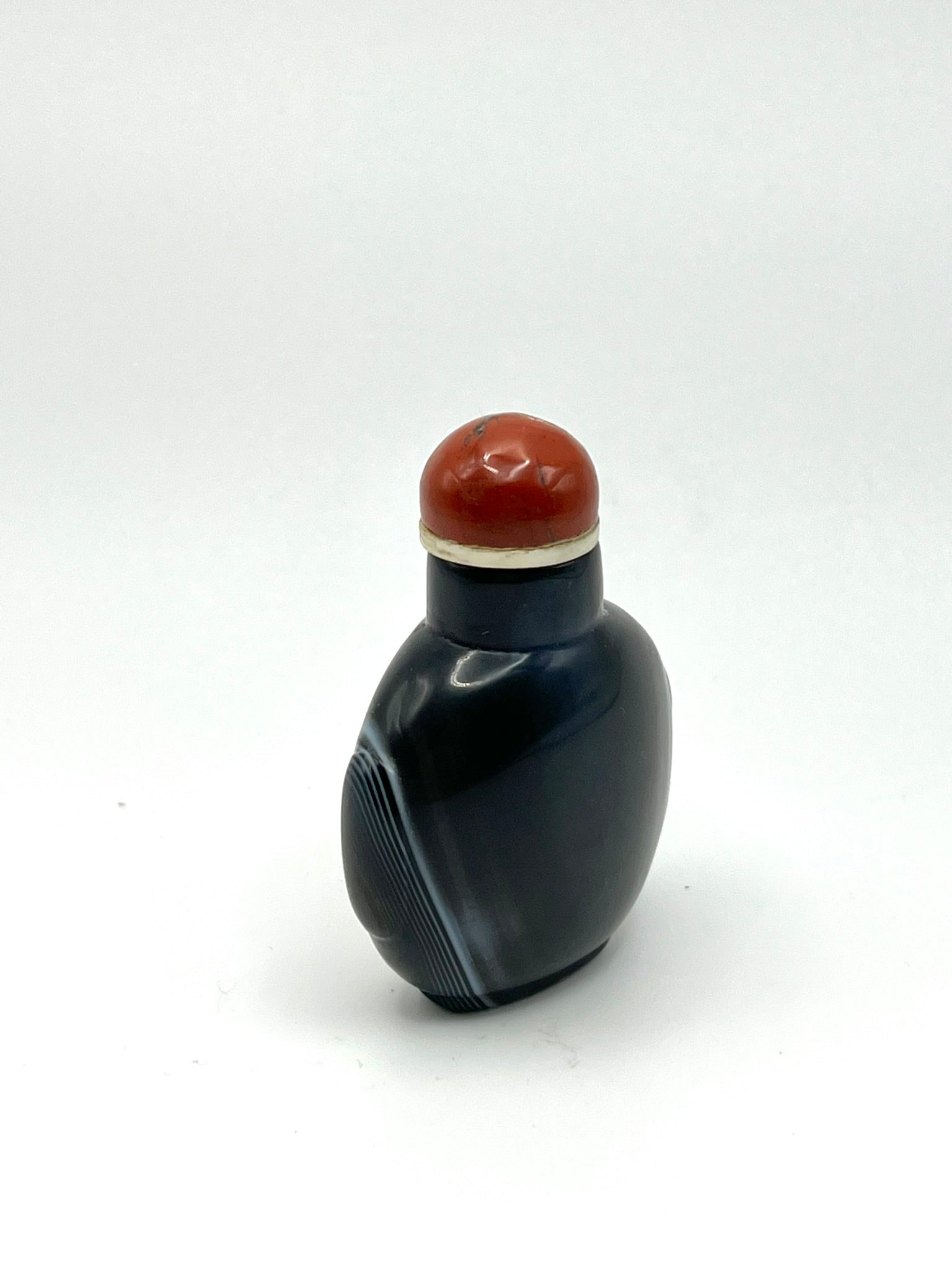 This is an unique black agate bottle. The carver was very ingenious to select a rock in the right proportions to be a snuff bottle and carved it making use of the parallel bands of white to be positioned at both sides. The end result is the white bands appeared to be "eyes." In my years of collecting, it is the only one of its kind. I find it to be very special. The bottle is small and it feels good to hold in my hands. It is of a flattened globular shape with a small raised oval foot which is nicely done. The opening is quite large for its size. It is still a vintage bottle made after 1970's, but it would be dated in the late 1970's to early 1980's. It has a bespoke or custom made stopper to enhance its appearance, a dome shape red jasper top on a beige collar.